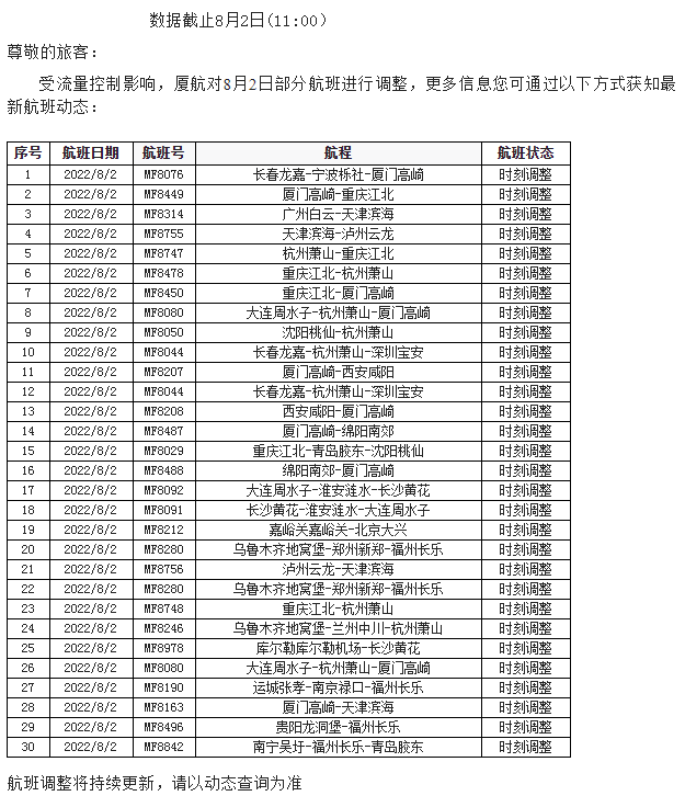 据厦门航空官网,受福建地区流量控制影响,厦航对8月2日部分航班进行调整。