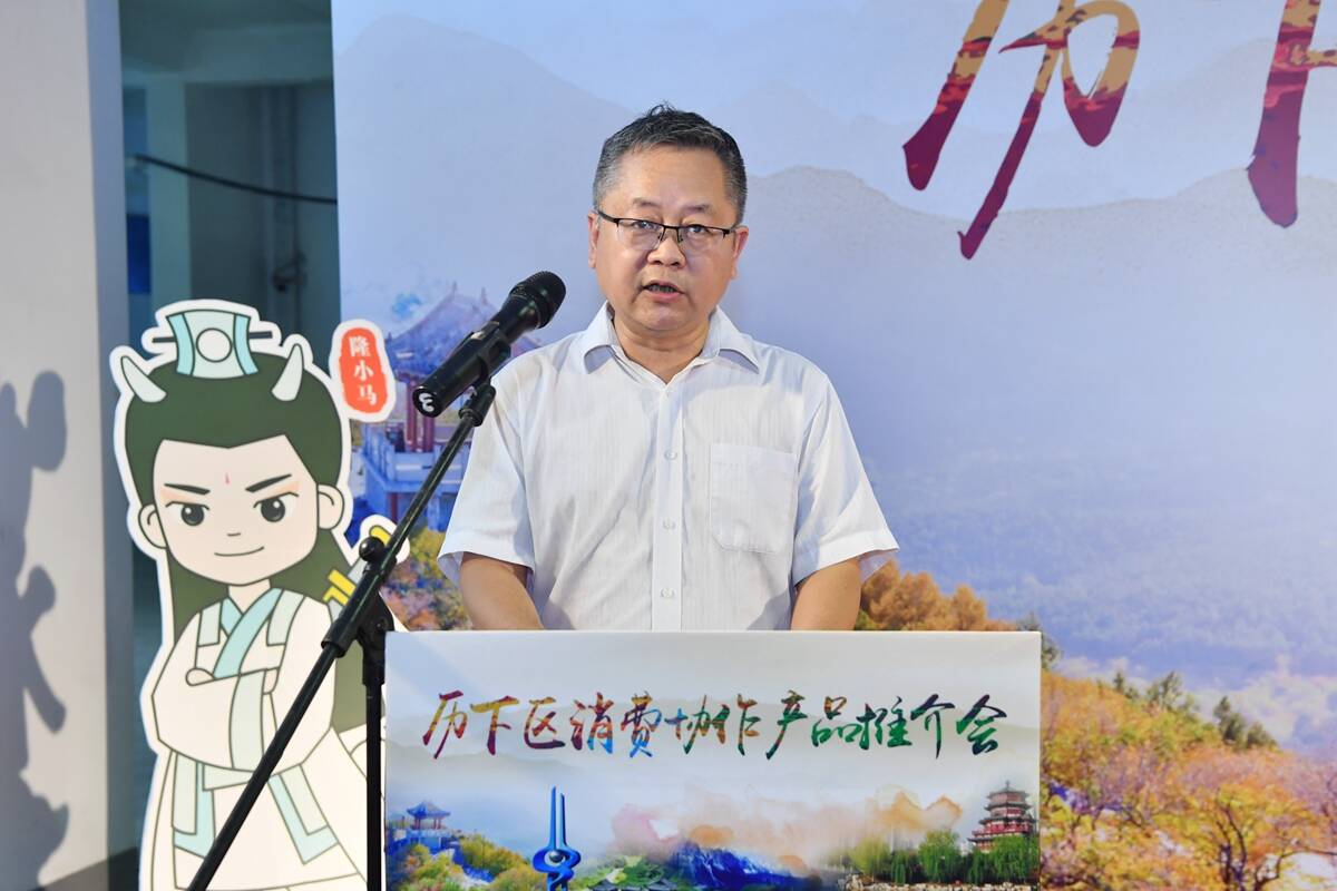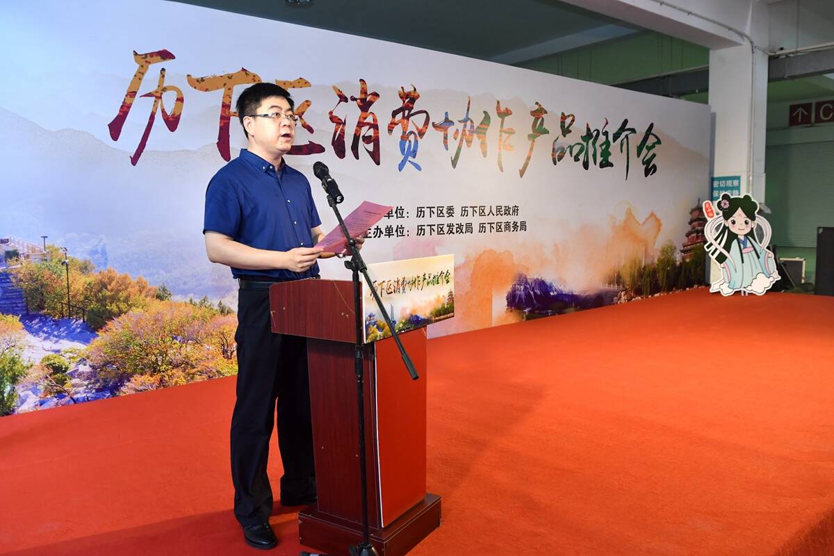 历下区商务局局长韩天颖主持并做活动介绍。此次活动为着力帮助重庆市武隆区实现巩固脱贫攻坚成果与乡村振兴的有效链接,全面提升历下区消费协作水平,通过对重庆武隆特色农产品的品鉴、展销,扩大消费协作规模。