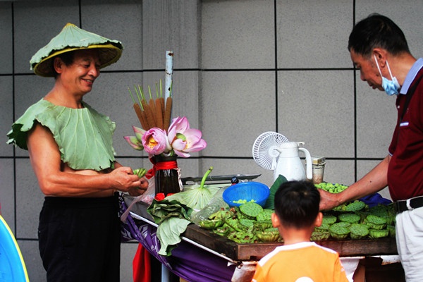 卖莲蓬的小贩打造氛围感,为自己设计了荷叶汗衫和小帽,脸上绽放着花一般的笑容。