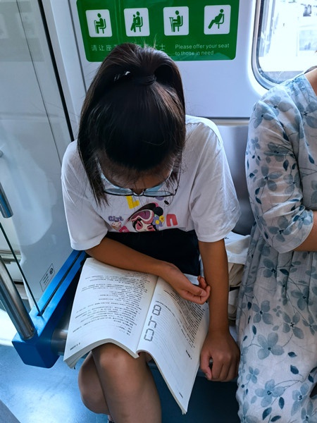 时值暑假,功课也不能完全落下。地铁1号线车厢里,女孩利用路途时间,沉浸在书本中。