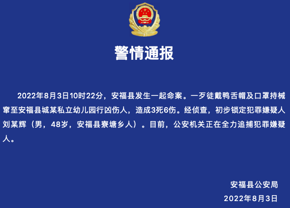 江西安福县公安局通报:2022年8月3日10时22分,安福县发生一起命案。一歹徒戴鸭舌帽及口罩持械窜至安福县城某私立幼儿园行凶伤人,造成3死6伤。经侦查,初步锁定犯罪嫌疑人刘某辉(男,48岁,安福县寮塘乡人)。目前,公安机关正在全力追捕犯罪嫌疑人。