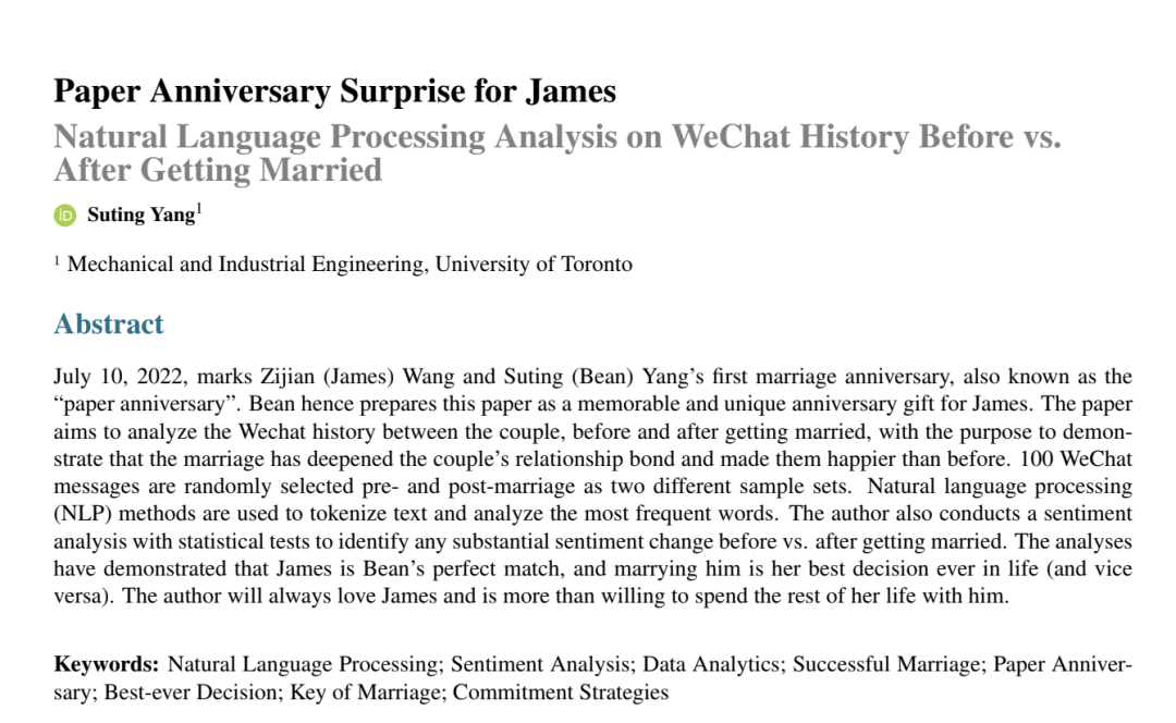 虽然提前知道了形式,但看到 paper 的那一刻,我老公还是非常惊喜。他是一个特别容易感动的人,所以当他看完摘要时,已经感动到痛哭流涕(略有夸张的成分,但眼角有湿润)。他认认真真地读了整篇文章,并表示这是他读过的最好的、最独一无二的 paper。