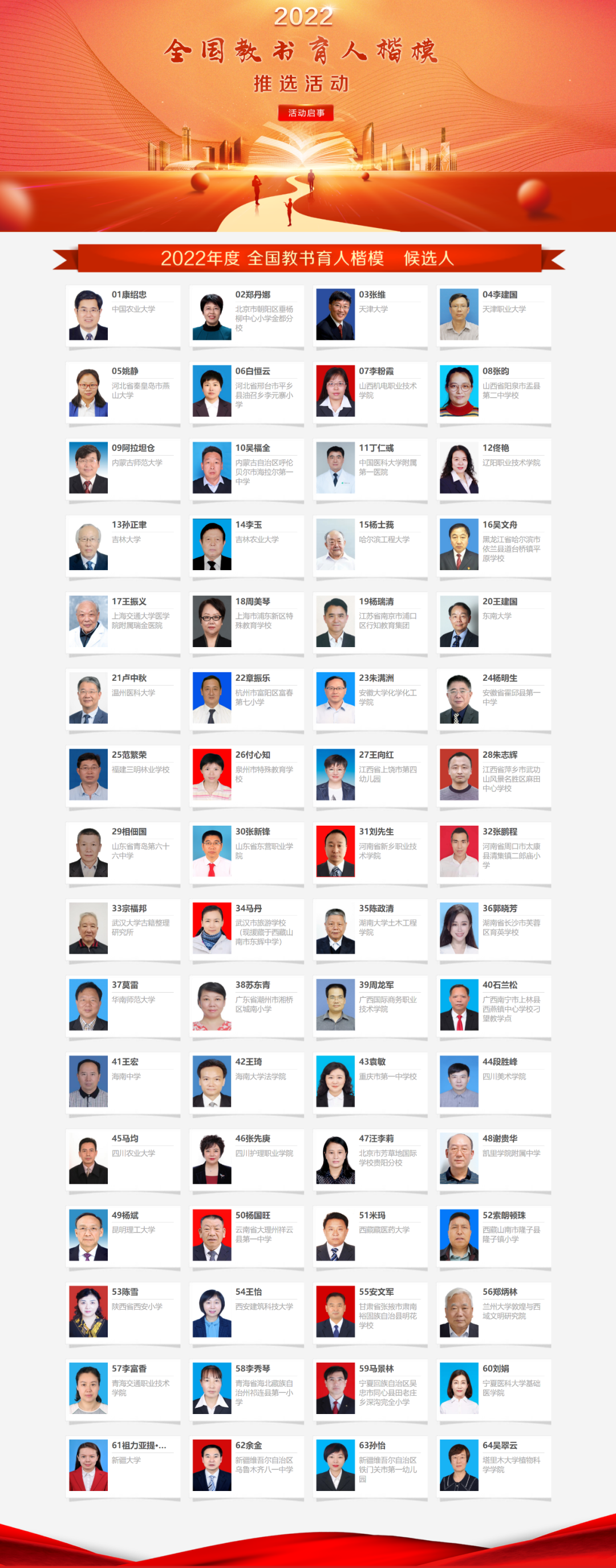 2022年度全国教书育人楷模推选活动近日启动。日前,活动组委会对各地推荐的候选人进行认真审核,确定64名全国教书育人楷模候选人,并面向社会公示,公示时间从8月2日至8月16日。