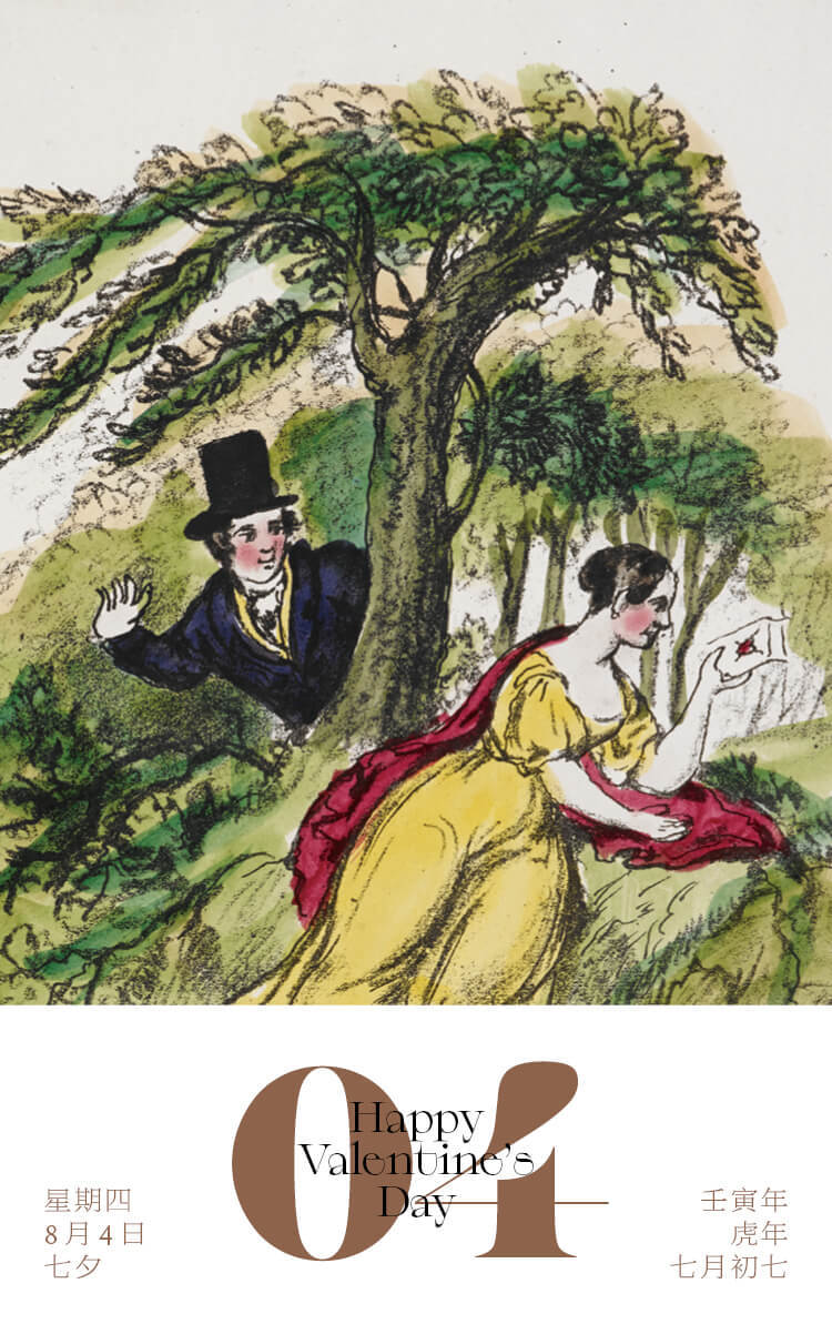 这是一张19世纪中期制作的情人节卡片,一名男子躲在树后面,偷看一位女子收到他送出的情人节礼物后的反应。在当时的英国,赠送情人节卡片是最受欢迎的一种示爱方式,每年有超过2500万张情人节卡片被寄出。