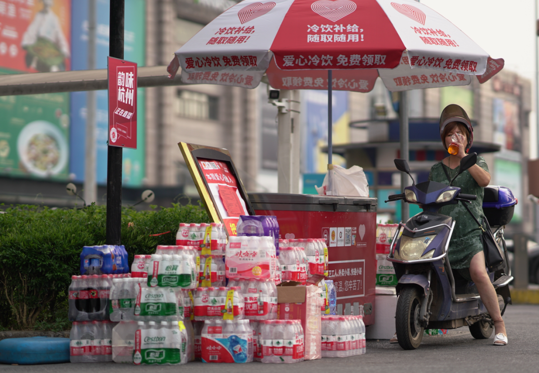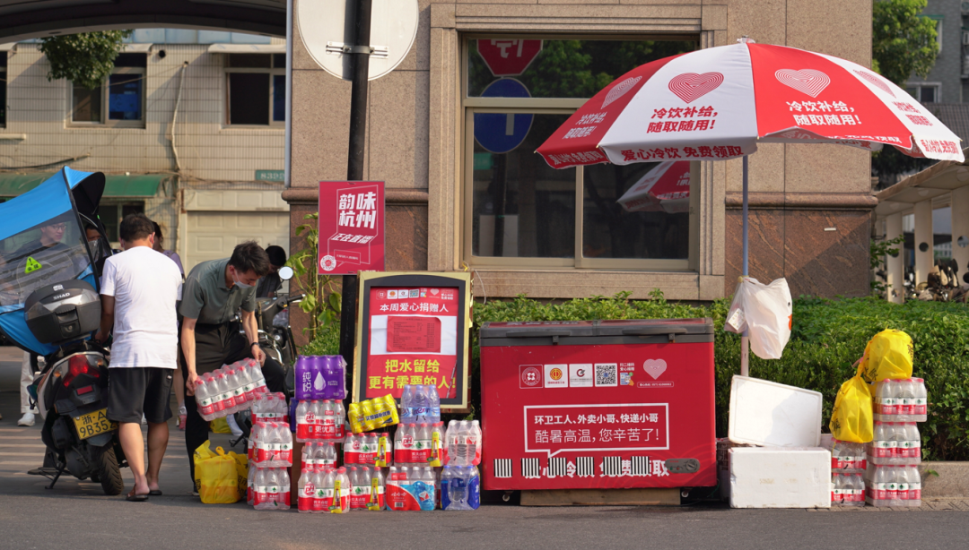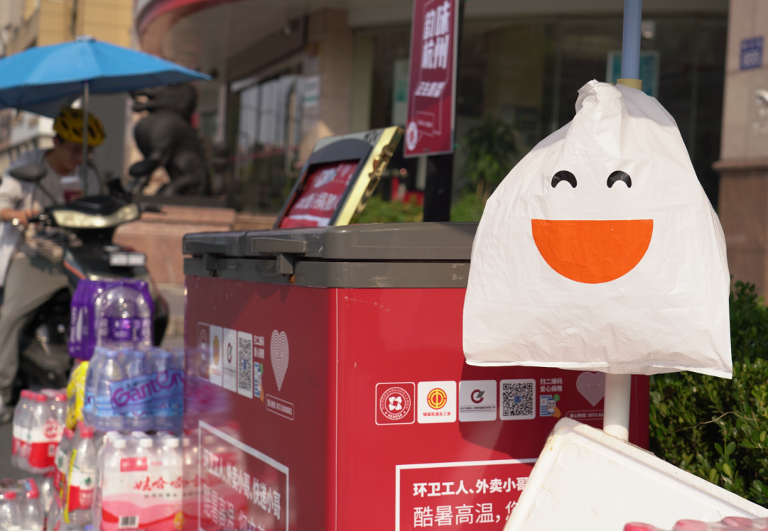 8月2日下午3点多,临安锦城街道万华广场上,气温38℃。一把红白相间的遮阳伞下,一台被包装成红色的冰柜,竟成了不少外卖小哥的送餐目的地。