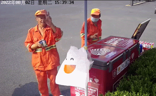 8月2日下午3点39分,两位环卫师傅从冰柜拿了冰棒和饮料,开心地对着直播镜头比了个“耶”的手势。