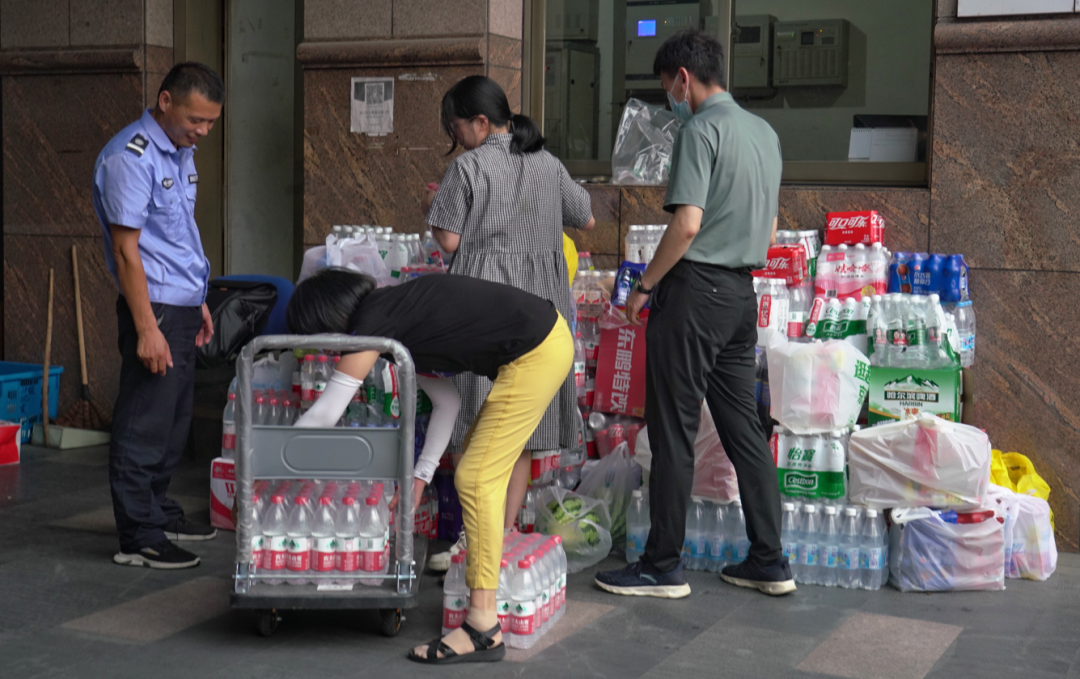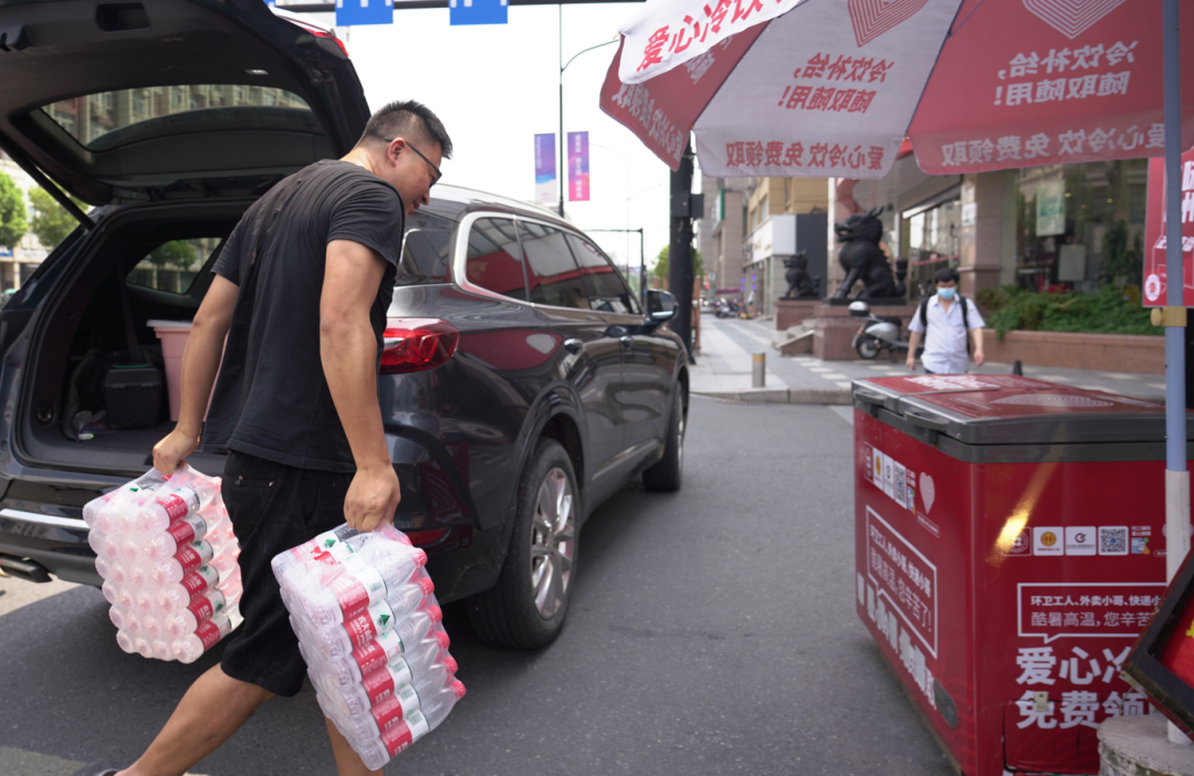 8月2日下午4点27分,陆续有市民送来一箱又一箱的冷饮,他们不约而同地将冷饮整齐放入冰柜,然后默默离去。