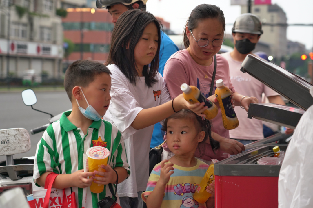 烈日当空的中午,上了年纪的环卫师傅走到冰柜边,将扫把往胳肢窝一夹,取出一瓶水,享受片刻的清凉;
