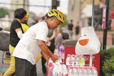 很快,冰柜的门关不严实了,斜斜地翘起了30度左右,冰柜两旁也堆满了市民送来的成箱的饮料。守着冰柜的工作人员不得不忙活起来,整理大家送来的一份份心意——矿泉水、可乐、奶茶、西瓜、棒冰……