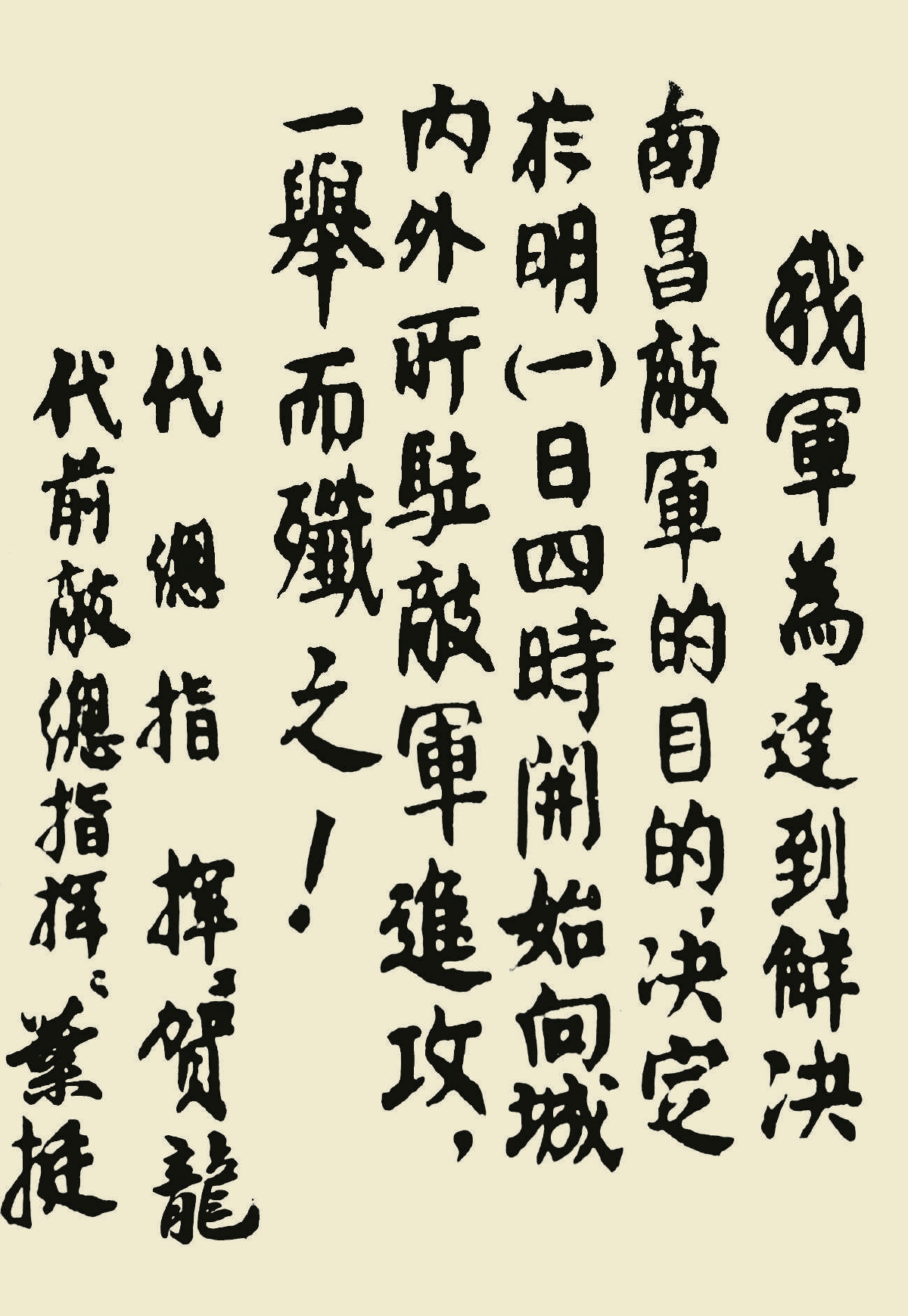 最惹人注目的是“起义军作战命令”。对照贺龙、叶挺两位的签名来看,书写“起义军作战命令”的可能另有其人。现今虽不知其名,但高超的书艺水平令人印象深刻,可见当时军中多文化才子,一手漂亮的毛笔字,让人叹服。从字形来看,主要是取法颜真卿楷书,笔画饱满厚重,字形开张大气,用来书写“作战命令”,再合适不过,有力地衬托了威武之师的形象。