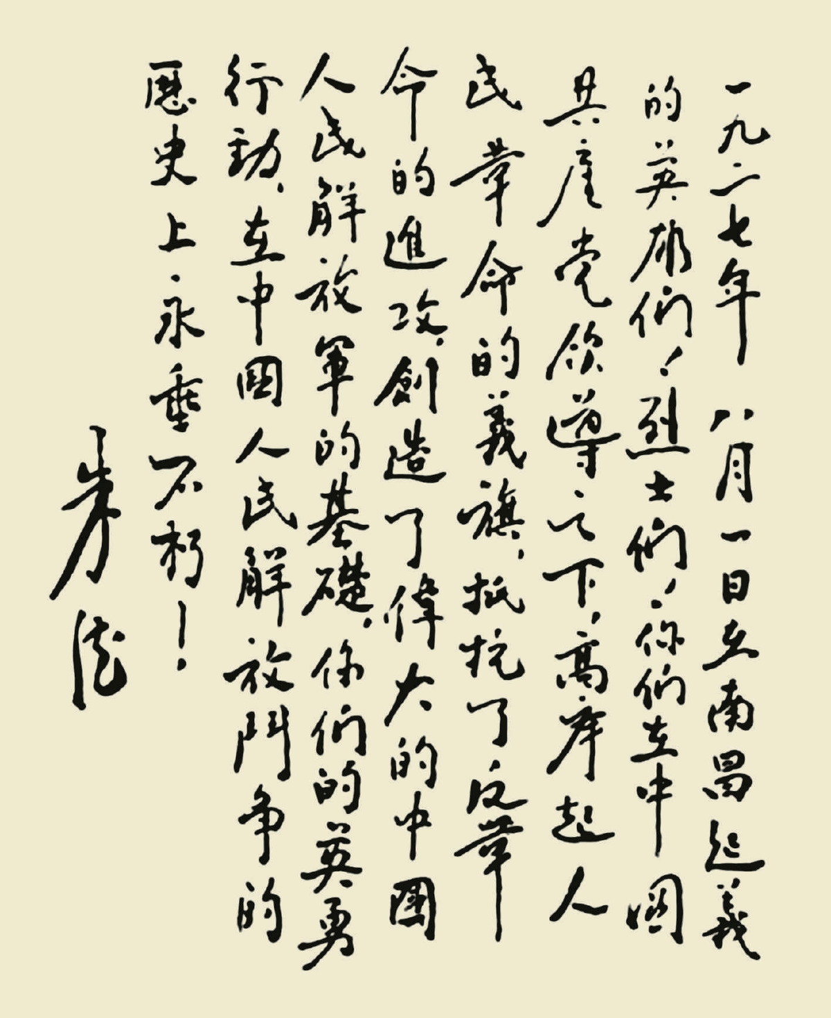 尽管因为时代变化剧烈,各种资料保存不易,仍能通过诸多途径发掘一些历史文献,以颇为特别的“书法”形式出现,见证了卓越领导人的风采,“文能提笔安天下,武能上马定乾坤”。需要说明的是,目前搜集到的资料,一部分是直接和“八一”南昌起义相关的题词等,一部分则是领导和参与起义人员的书法作品,集中展现,藉以缅怀先烈,不忘历史。