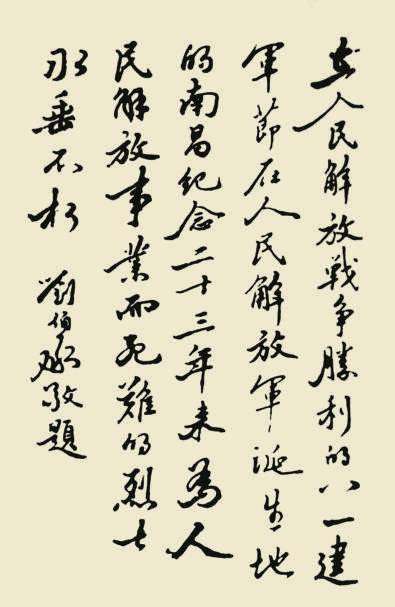 刘伯承书法主取王羲之、赵孟頫而自出机杼,行笔夸张而各见变化,尤其是同字变化功夫,令人称道,题词中的“人民、解放”多次出现,不欲变而自然变,可见临池功夫深厚。