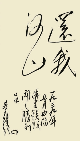 聂荣臻所书“还我河山”乃意临岳飞之作,亦能自出己意。起始“还”字温雅,不激不励,此时情感尚在酝酿之中,“我”字书写速度已经加快,尤其是右侧撇画,相对粗壮醒目,令人印象深刻,大有“我以我血荐轩辕”之意,“河山”二字连带,“山”字顿笔而收,戛然而止,回味无穷。