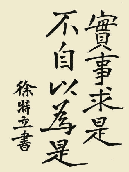 徐特立是南昌起义中目前有名可考的参加者中年纪最大的一位。其书法学颜鲁公、学魏碑,此题词尤以后者为主,似是《张猛龙碑》,笔画瘦硬劲健,撇捺画放纵,字形开张,两行未皆为“是”字,自然生变,同中有异,创作意识明确。