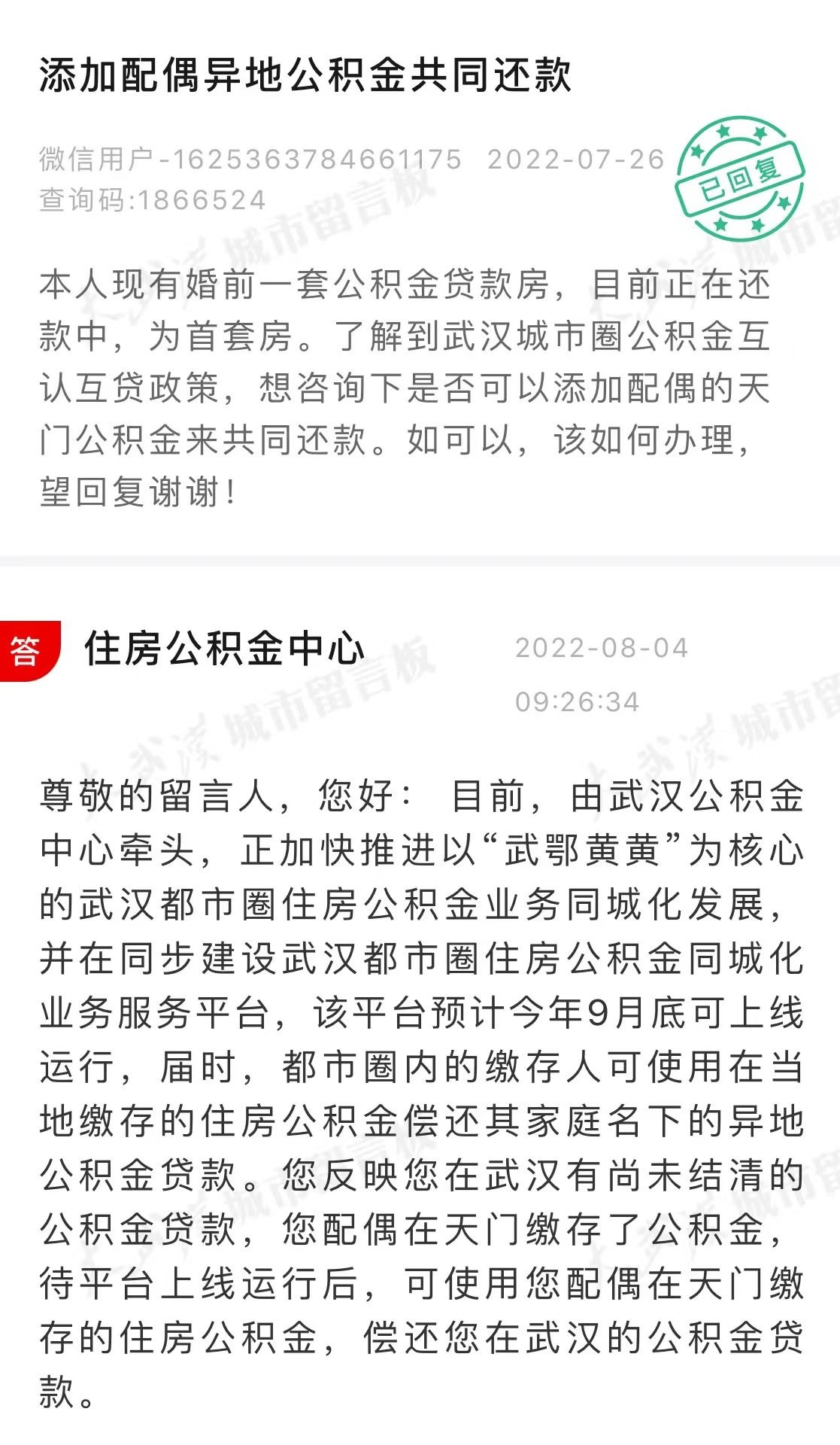 武汉住房公积金管理中心:目前,由武汉公积金中心牵头,正加快推进以“武鄂黄黄”为核心的武汉都市圈住房公积金业务同城化发展,并在同步建设武汉都市圈住房公积金同城化业务服务平台,该平台预计今年9月底可上线运行,届时,都市圈内的缴存人可使用在当地缴存的住房公积金偿还其家庭名下的异地公积金贷款。您反映您在武汉有尚未结清的公积金贷款,您配偶在天门缴存了公积金,待平台上线运行后,可使用您配偶在天门缴存的住房公积金,偿还您在武汉的公积金贷款。