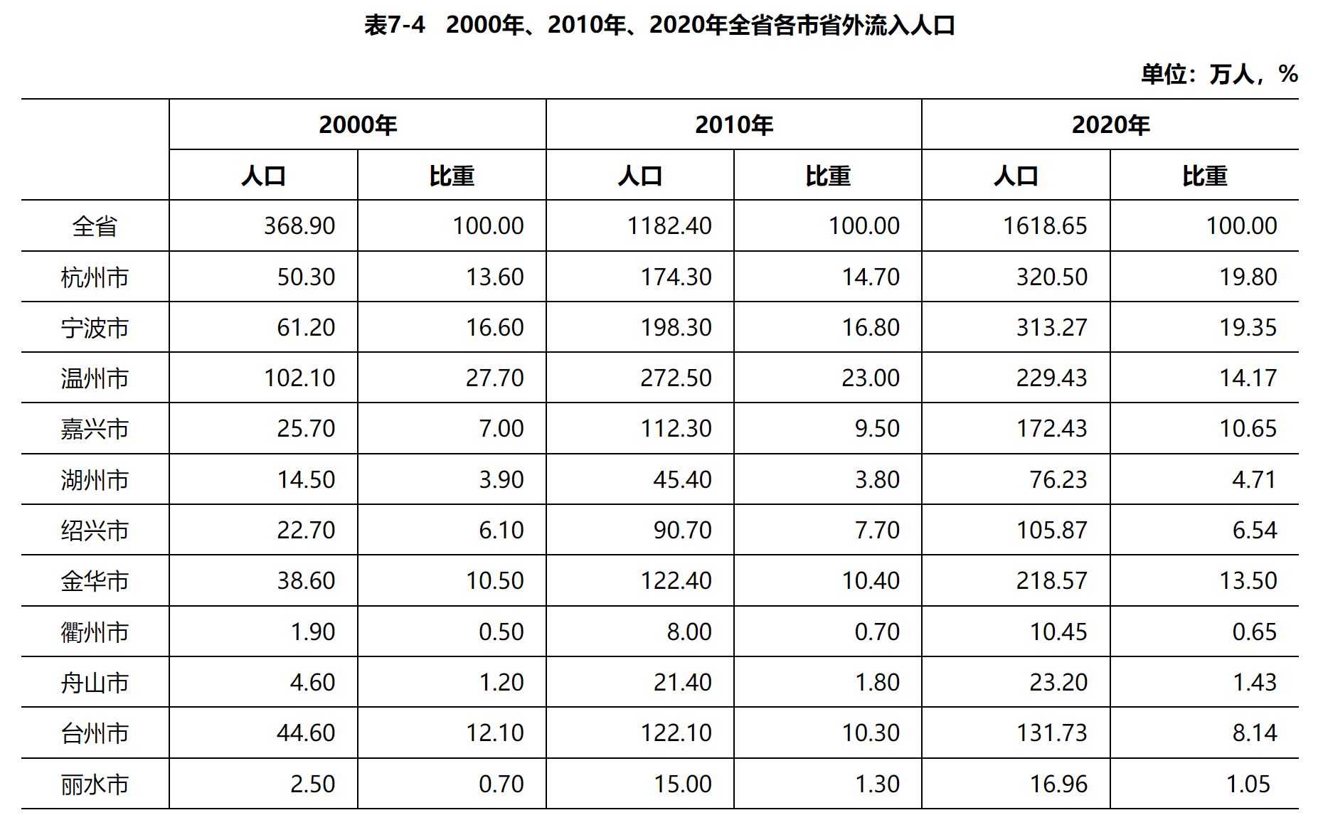 值得注意的是,浙江省统计局近日发布的浙江流动人口数据分析显示,2020年浙江外流人口也达到236.22万人。其中,温州、台州和丽水三个市共有出省人口126.73万人,占比超五成。温州一市常住省外人口就达到72.45万人,独占全省超三成。