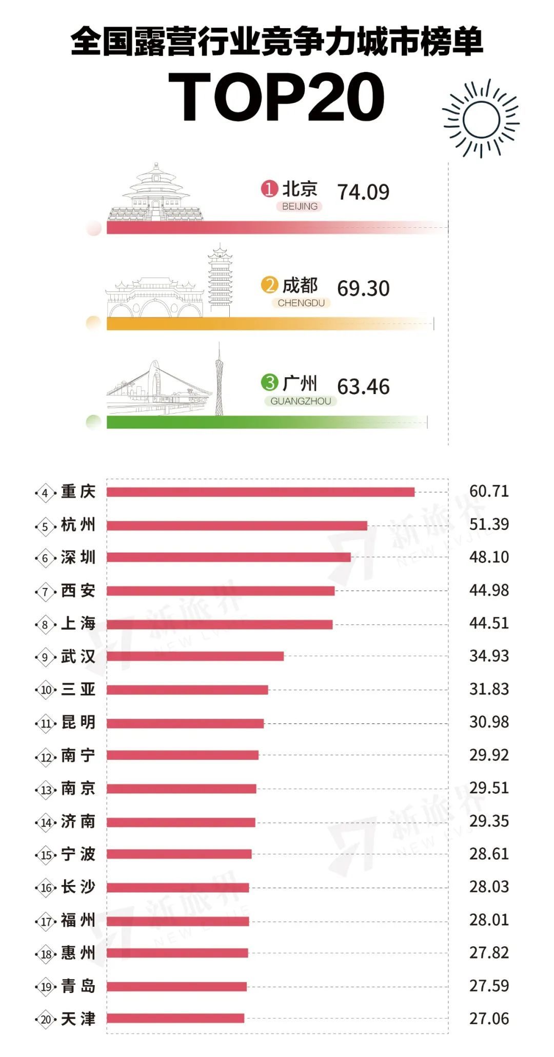 露营行业竞争力城市20强,北京、成都、广州居前三
