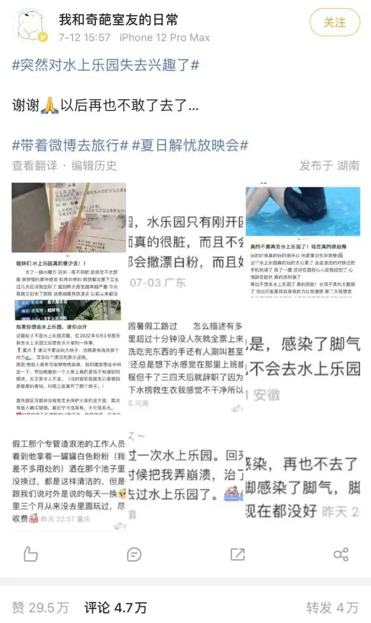 在这个阅读量高达5.3亿、讨论数近6万的热门话题中,不少人将矛头直指水上乐园的卫生问题,列举了自己亲身经历的惨痛教训——