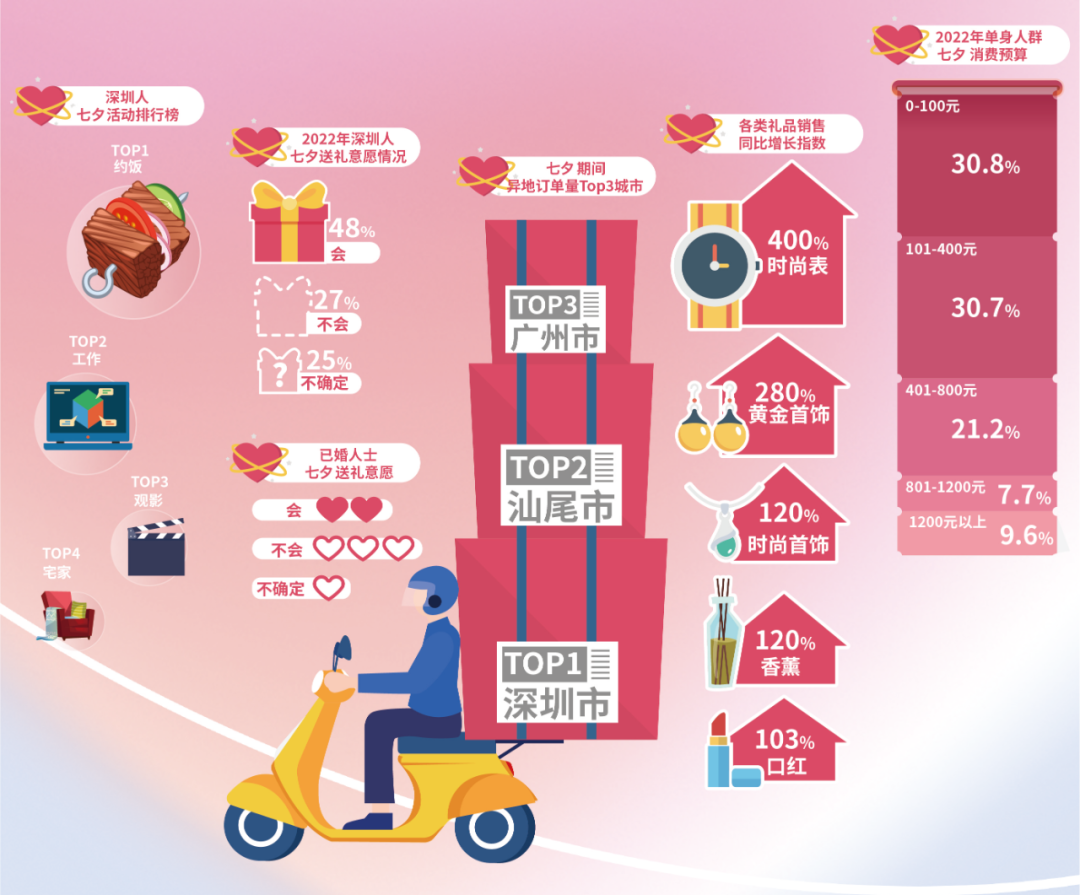 对于七夕节当天无法见面的异地情侣来说,送礼物来表达思念是绝佳选择。京东消费显示,七夕节期间,全国异地订单量(发送给非常用地址所在城市的订单)飙升,其中,深圳、汕尾、广州市成为异地订单量占比TOP3城市。