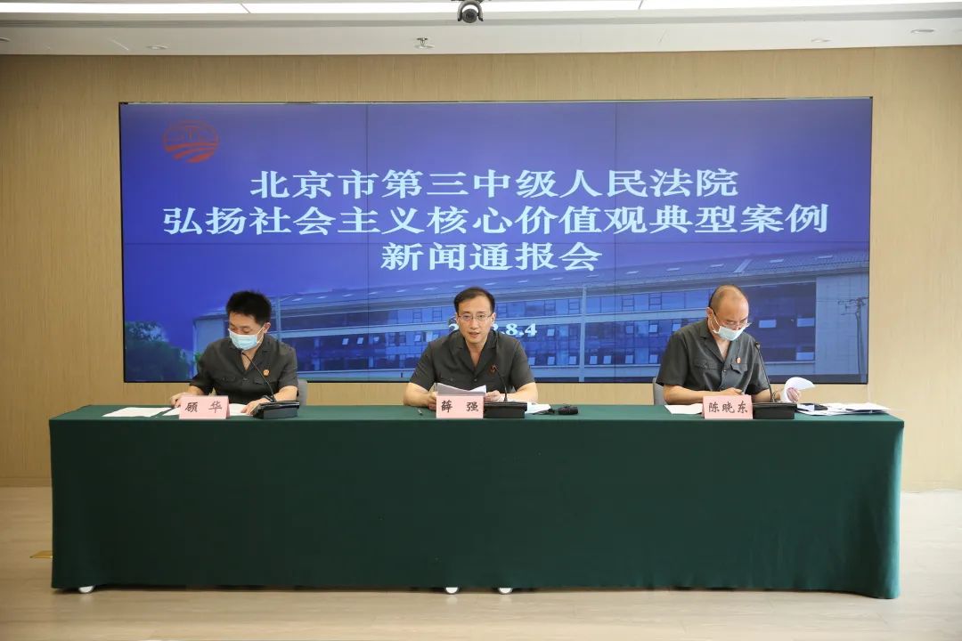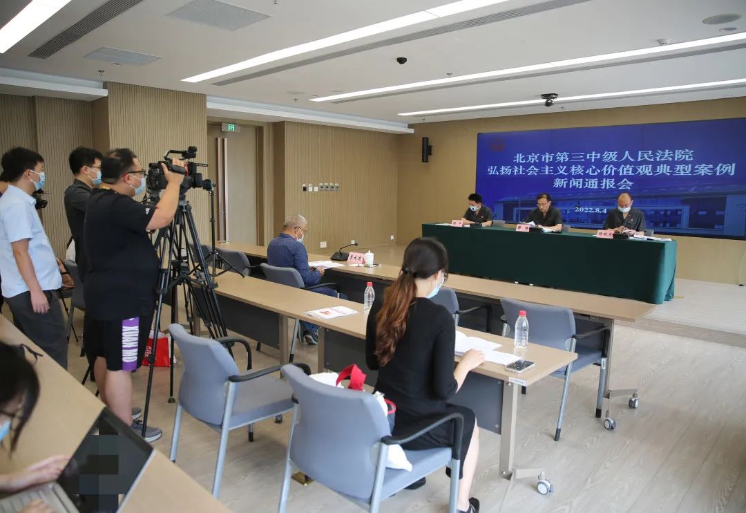 为培育和践行社会主义核心价值观,充分发挥司法审判教育、评价、指引、规范功能,2022年8月4日上午,北京市第三中级人民法院召开弘扬社会主义核心价值观典型案例新闻通报会。