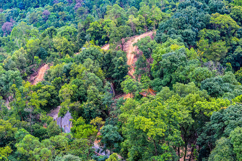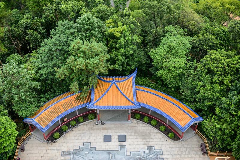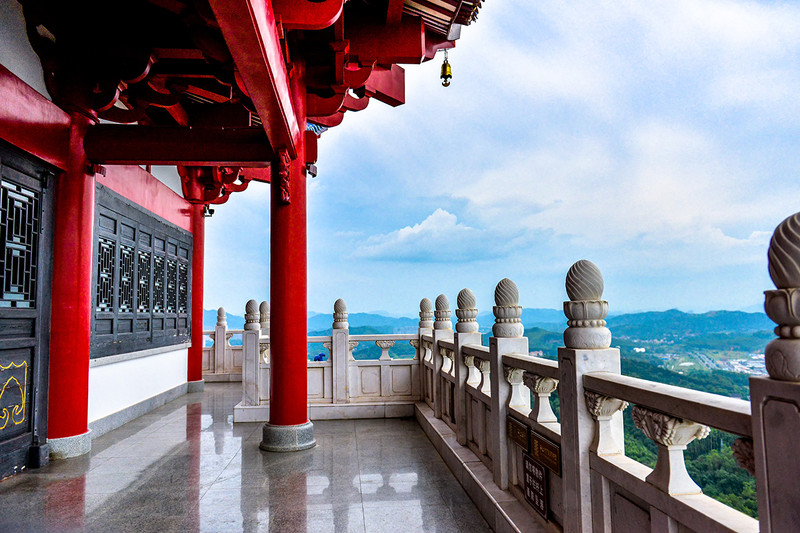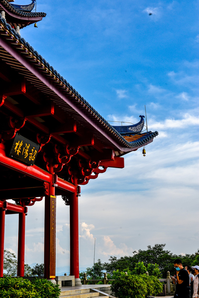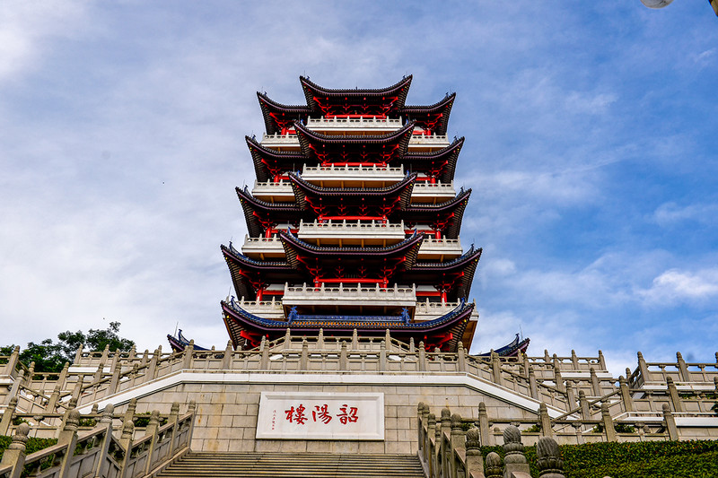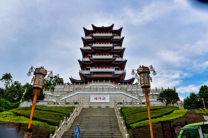 韶阳楼坐落在韶关国家森林公园莲花山的山巅之上,从森林公园大门口有景交车可以直达。这座楼建筑风格和黄鹤楼颇为相似,同样采用唐宋古建筑风格,同样层层出挑的平座栏杆,同样翘起的灵动的翼角,同样恢宏、庄重又不失灵气。