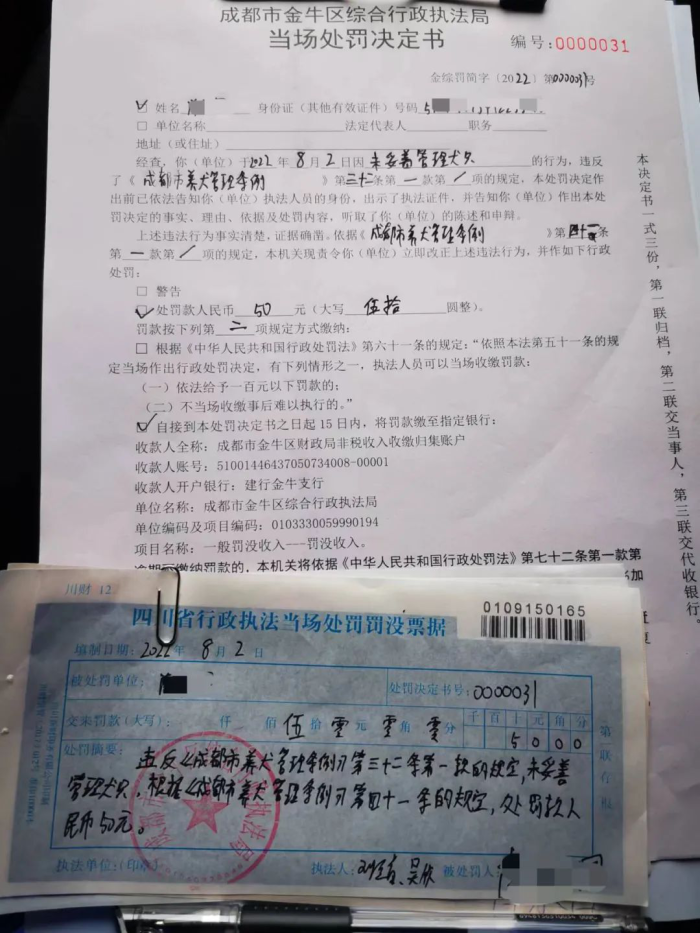 近日,记者从金牛区综合行政执法局了解到,2日晚,该局对遛狗不拴绳、不清理犬粪、携犬进入公共场所等“不文明养犬”行为进行联合整治,按照《成都市养犬管理条例》第三十二条第一款的规定,依据《成都市养犬管理条例》第四十一条的规定,对“不文明养犬”市民,现场开具全区首张行政处罚决定书,罚金为50元。