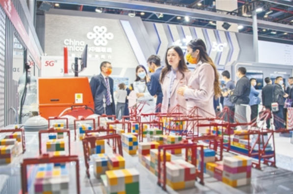 2021年11月19日,参观者在“5G+工业互联网成果展”上观看展出模型