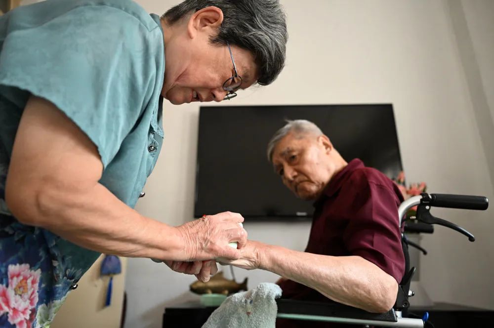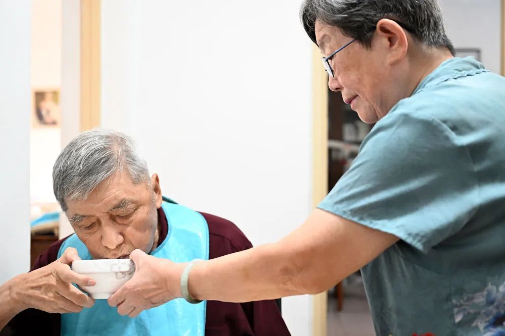 早上起床后,段肇谊(左)帮助顾伟力洗手(7月26日摄)。新华社记者 赵子硕 摄
