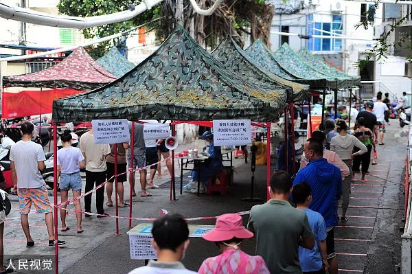 2022年8月4日,三亚,市民在排队进行核酸采样。图/人民视觉