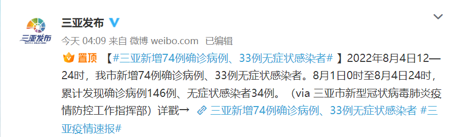 据三亚市新型冠状病毒肺炎疫情防控工作指挥部今天凌晨通报,2022年8月4日12—24时,该市新增74例确诊病例、33例无症状感染者。8月1日0时至8月4日24时,累计发现确诊病例146例、无症状感染者34例。