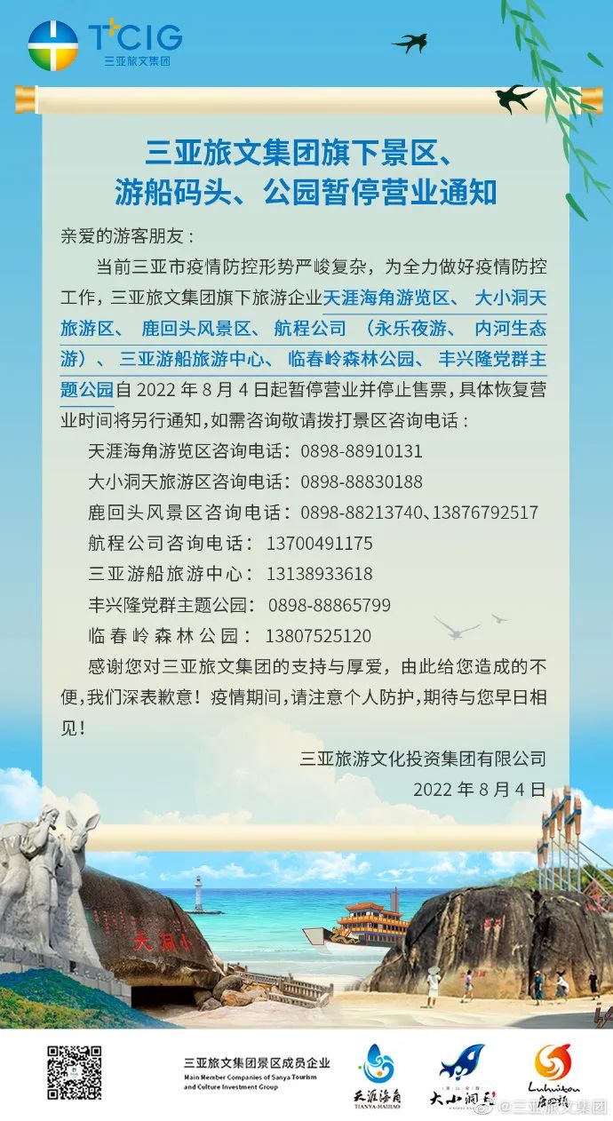 记者从三亚旅文部门了解到,因受疫情影响,为配合做好疫情防控工作,切实保障广大游客朋友们的人身安全,三亚亚龙湾国际玫瑰谷、天涯海角游览区、临春岭森林公园、三亚水稻国家公园、亚龙湾热带天堂森林等多家景点、旅游区定于2022年8月4日起暂停营业,具体恢复营业时间另行通知。