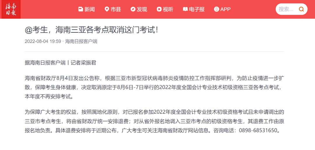 据@海南日报 :取消原定于8月6日-7日举行的2022年度全国会计专业技术初级资格三亚各考点考试,本年度不再安排考试。