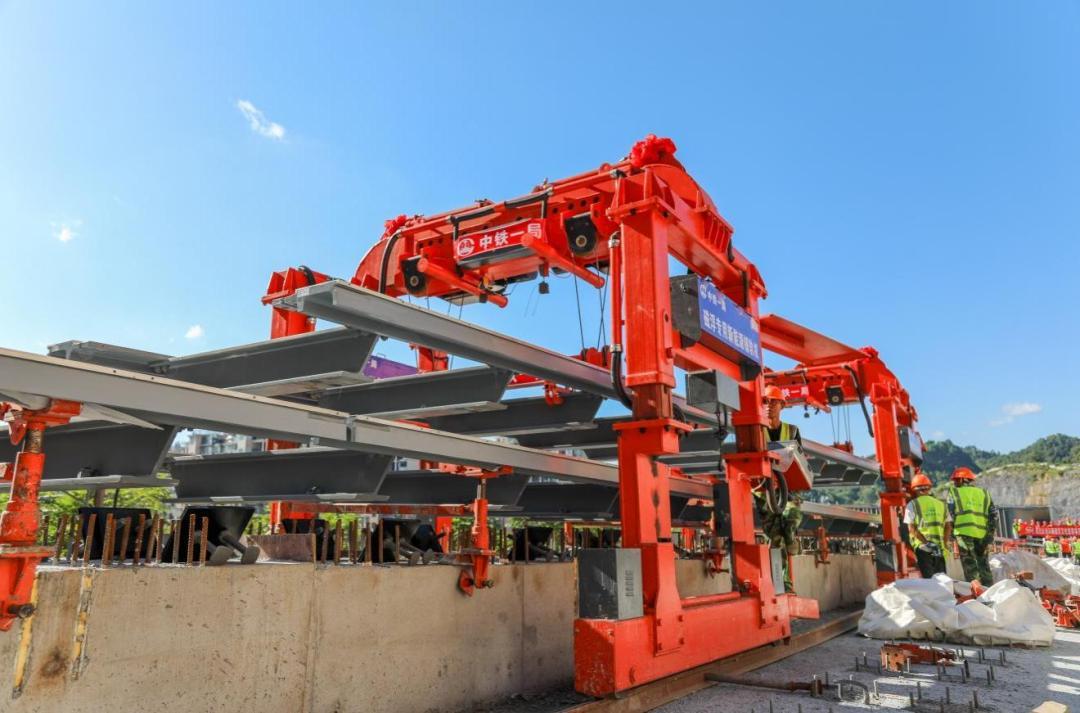 凤凰磁浮观光快线属山地磁浮,全线多为高架桥,地形地貌复杂、地面起伏多变、路桥隧交替频繁。为确保施工生产顺利进行,自2020年12月22日开铺以来,中国中铁一局先后投入新能源铺轨机10台、磁浮轨排运输车1台、35吨汽车吊10台,400余名参建员工经过10个多月的日夜奋战,严格履约,与业主单位和各参建方精诚合作,施工进度和施工质量受到各方的一致认可。