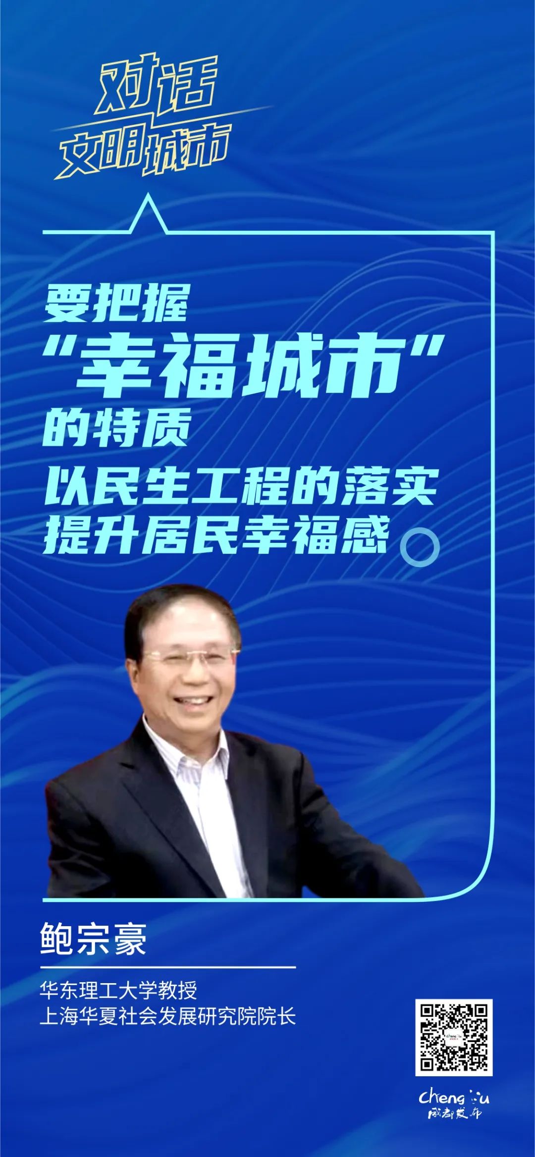 在鲍宗豪看来,成都争创全国文明典范城市,要把握“幸福城市”的特质,以民生工程的落实提升居民幸福感,要注重道德精神、志愿服务精神、人文精神的重塑和政治意识、规则意识、文明意识的培育,以此重塑城市精神。