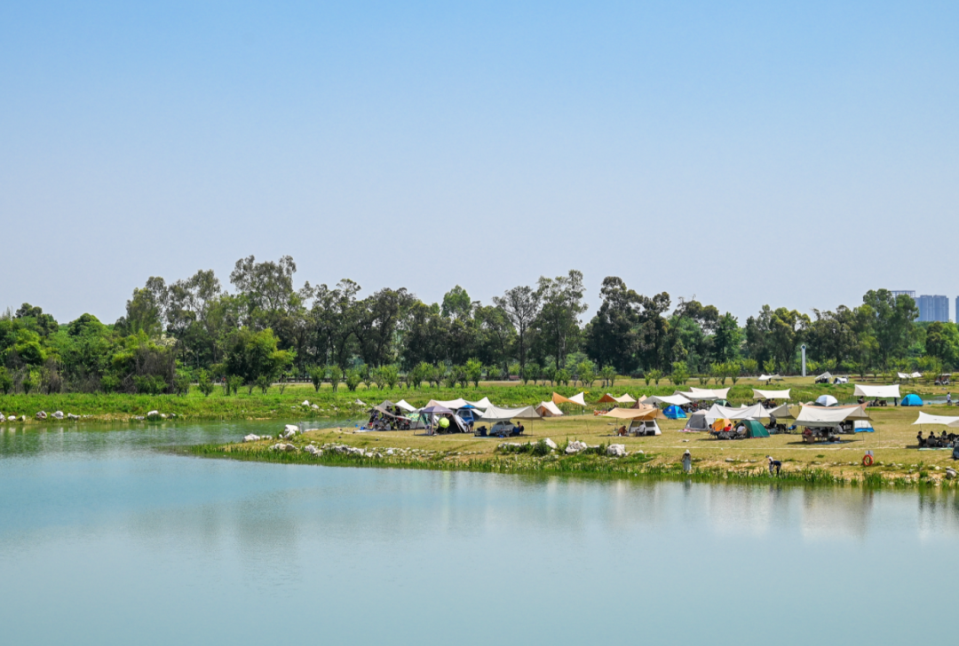 市民在青龙湖湿地公园湖边露营