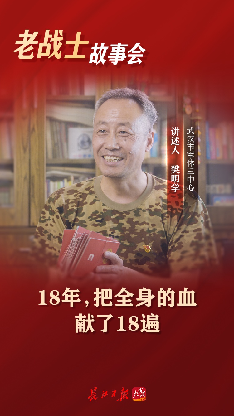 长江日报大武汉客户端8月5日讯(记者刘晨玮)退伍老战士樊明学坚持无偿献血已有18个年头。2004年,他第一次在中山公园附近走上献血车,至今,累计无偿献血237次,捐献全血1800毫升、成分血307个治疗量,献血量高达7.34万毫升,为挽救300多名陌生人的生命作出奉献。