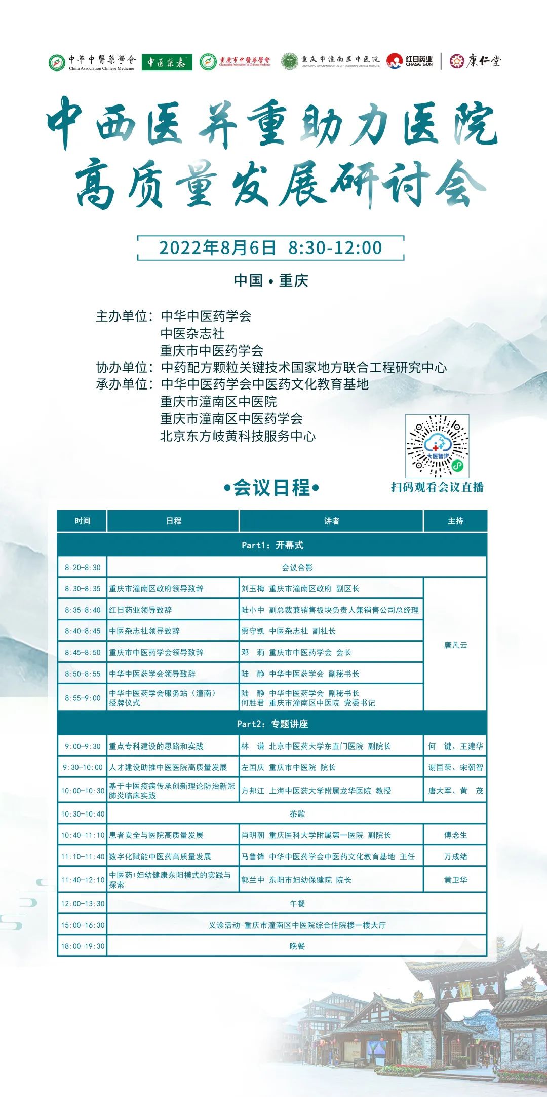 为进一步落实《中共中央国务院关于促进中医药传承创新发展的意见》和《关于加快中医药特色发展的若干政策措施》,全面建立符合中医药特点的医院服务体系、服务模式、管理模式、人才培养模式等,聚焦提质增效促进医院高质量发展,中华中医药学会、中医杂志社,重庆市中医药学会联合主办“中西医并重助力医院高质量发展研讨会”,并拟定于2022年8月6日在重庆市召开。