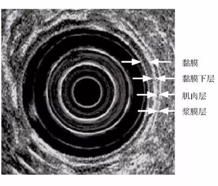 在超声内镜下,消化道管壁可呈5层结构,其回声特点显示为高-低-高-低-高 的层次结构,由内到外分别对应组织学上的浅层黏膜-深层黏膜及固有层-黏膜下层-固有肌层-外膜层。应用超声内镜,便可对消化道管壁一览无余,病变再无藏身之地。