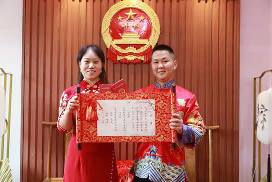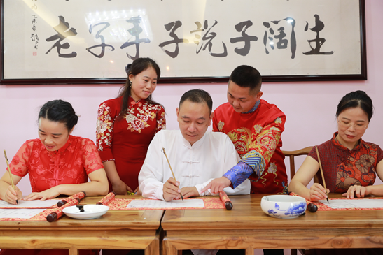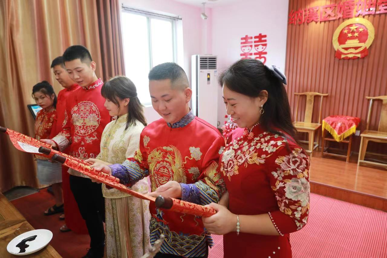 8月4日,农历七月初七,是中国的“情人节”。四川省泸州市纳溪区民政局婚姻登记处颁证厅里面,纳溪区政协诗书画院的书法家们,身着传统服装,在溢满墨香的氛围里,给今天结婚的新人们手写的“婚书”,见证了别具一格的浪漫,留下美好的回忆。
