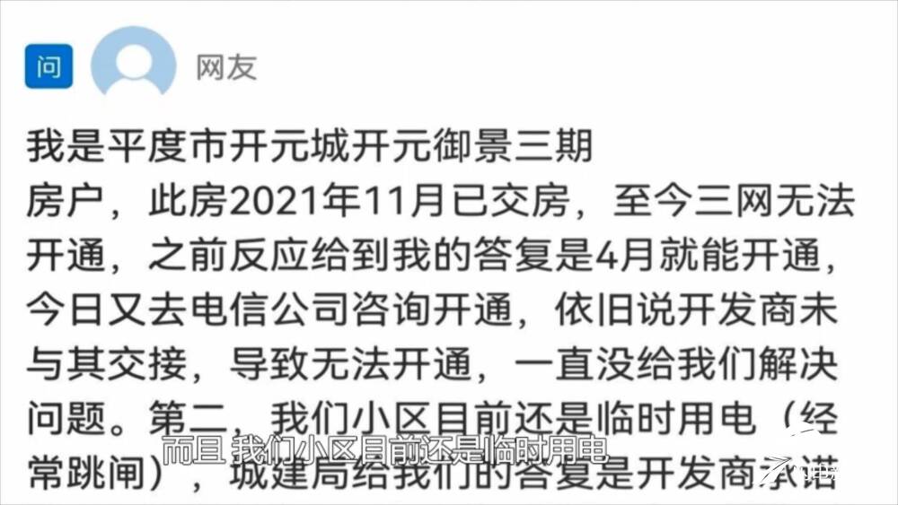 齐鲁网·闪电新闻8月5日讯 急难愁盼事,件件抓落实。青岛的一位网友,在《问政山东》网络问政平台留言:我是平度市开元城开元御景三期业主,去年11月交房,至今三网无法开通。而且,小区目前还是临时用电,经常跳闸,生活非常不方便,希望相关部门能够解决一下。