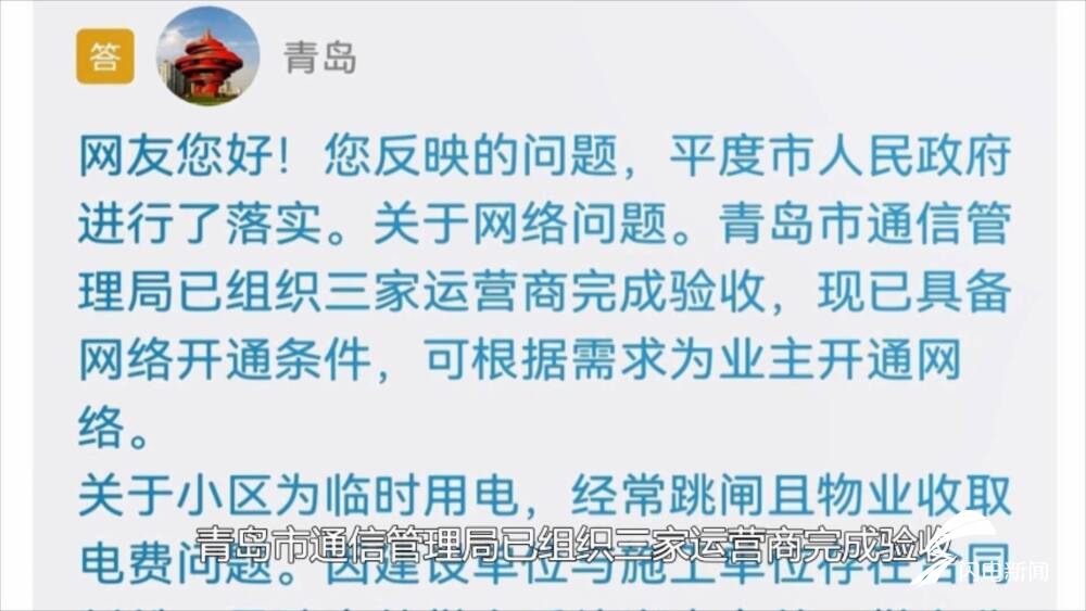 收到留言后,青岛市进行了落实并回复:关于网络问题,青岛市通信管理局已组织三家运营商完成验收,现已具备网络开通条件,可根据需求为业主开通网络。