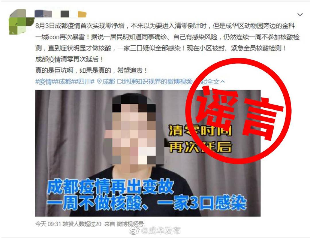 8月5日,一则“金科一城一家三口未做核酸感染新冠”消息在网上流传。成都市“成华发布”官方微博发布消息称,经成华区新冠疫情防控指挥部核实,此信息为谣言。疫情信息请广大网民以官方权威发布为准,切勿信谣传谣!