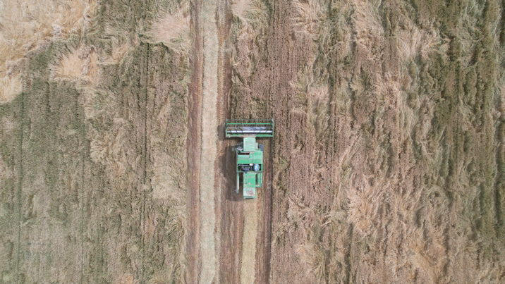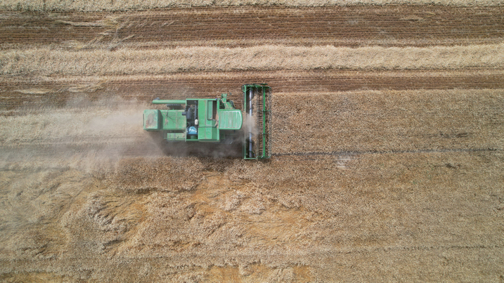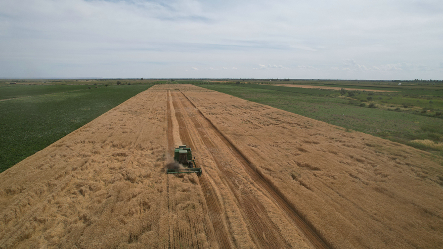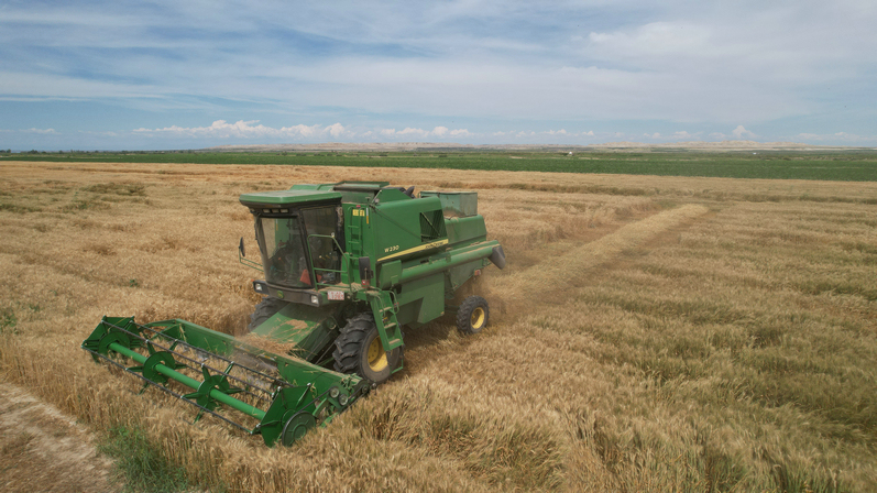 近日,收割机正在新疆阿勒泰地区福海县一家农场收割小麦。