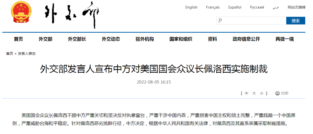 美国国会众议长佩洛西不顾中方严重关切和坚决反对执意窜台,严重干涉中国内政,严重损害中国主权和领土完整,严重践踏一个中国原则,严重威胁台海和平稳定。针对佩洛西恶劣挑衅行径,中方决定,根据中华人民共和国有关法律,对佩洛西及其直系亲属采取制裁措施。