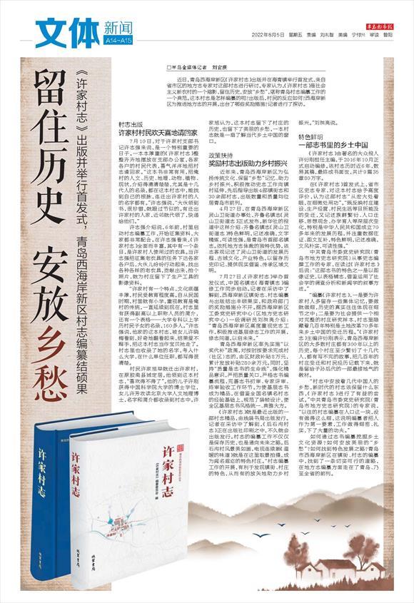 近日,青岛西海岸新区《许家村志》出版并在海青镇举行首发式,来自省市区的地方志专家对这部村志进行研讨。专家认为,《许家村志》是社会主义新农村的一个缩影,留住历史,安放“乡愁”,堪称青岛村志编纂工作的一个典范。这本村志是怎样编纂的呢?出版后,村民的反应如何?西海岸新区为推进地方志的开展,出台了哪些奖励措施?记者进行了探访。