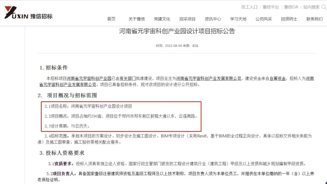 8月4日,一条关于河南省元宇宙科创产业园设计项目招标公告在《中国招标投标公共服务平台》《河南豫信招标有限责任公司网》平台同时发布。