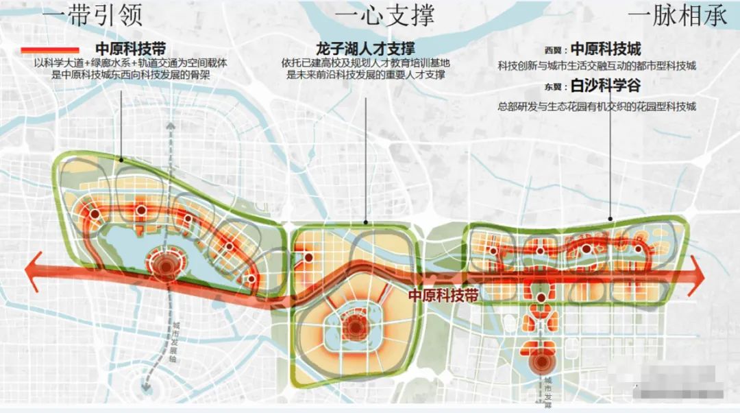 中原科技带的使命是围绕创新驱动发展,着力打造国家极具活力的区域科技创新中心。按照总体布局,它要围绕产业链完善创新链,围绕创新链布局产业链,产业结构向高精尖方向提升,在未来前沿、区域愿景、城市潜力三个维度下聚焦五大核心产业——数字文创、信息技术、前沿科技、生命科技、人才教育。