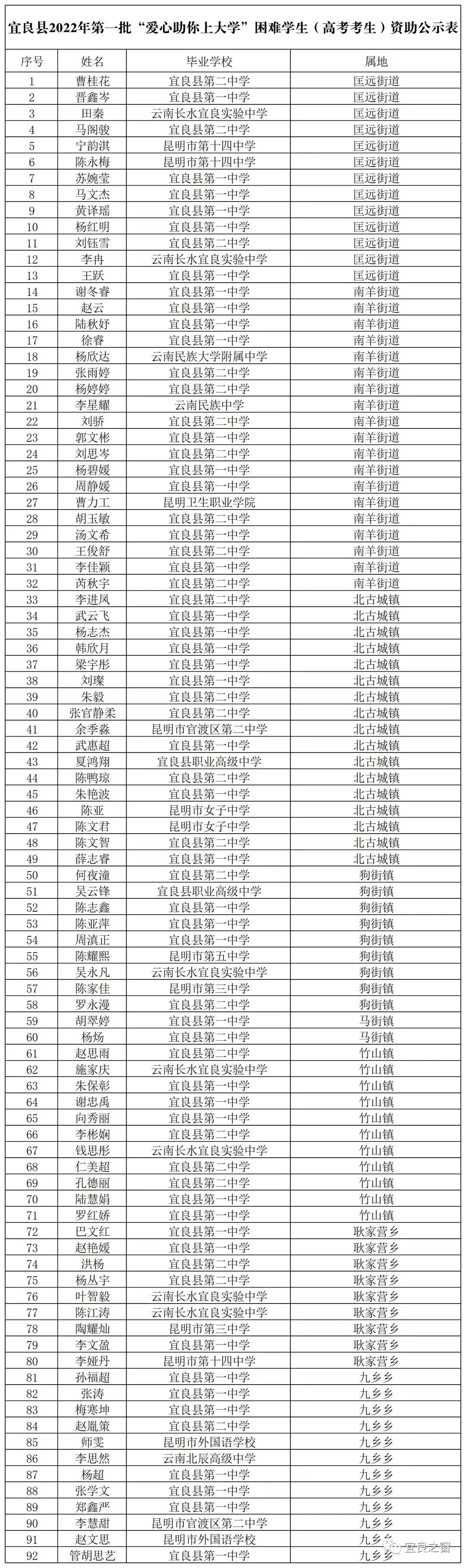 宜良县2022年第一批“爱心助你上大学”困难学生(高考考生)资助名单公示