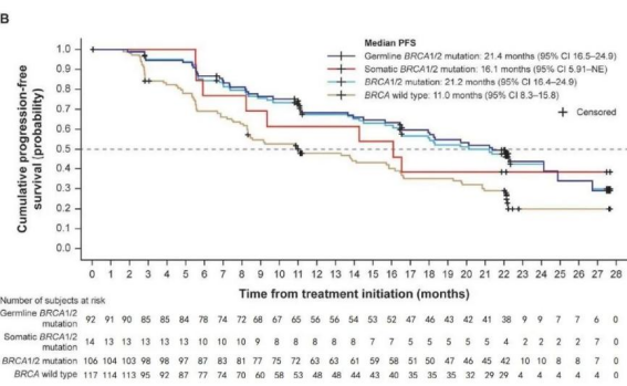 此外,不论BRCA基因突变如何,PSR人群均能从PARP抑制剂中获益。既往接受2线治疗的BRCAm亚组、BRCAwt亚组的mPFS分别为24.87和14.09个月。既往接受≥3线治疗的BRCAm亚组、BRCAwt亚组的mPFS分别为13.93和8.08个月。