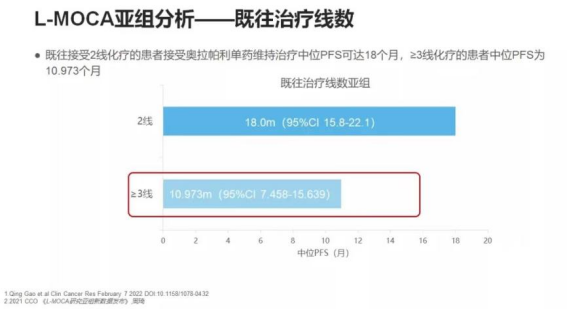本次在CCO大会上L-MOCA研究公布了亚组分析结果,结果显示:既往治疗线数越少,患者越能从PARP抑制剂维持治疗中获益,2线患者的中位PFS可达18.0个月,远高于≥3线患者 (中位PFS 10.973个月),证实越早使用PARP抑制剂,维持治疗的疗效越好。